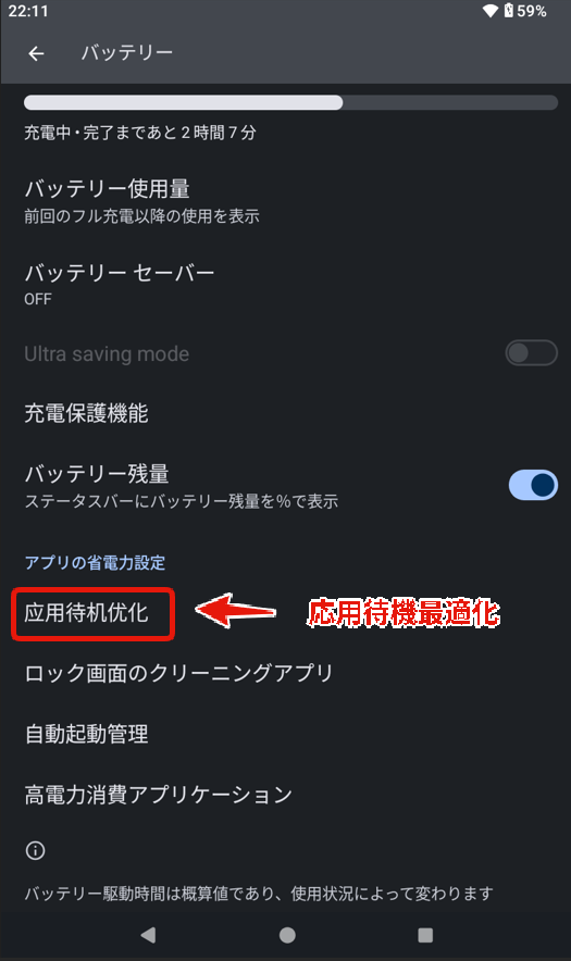 • 設定 → バッテリ →応用待機最適化