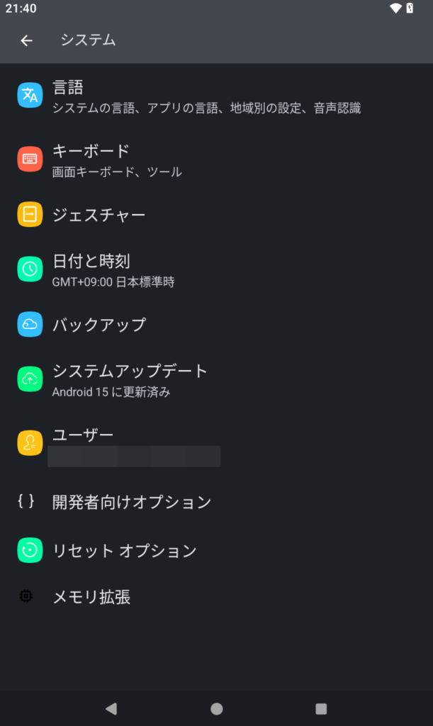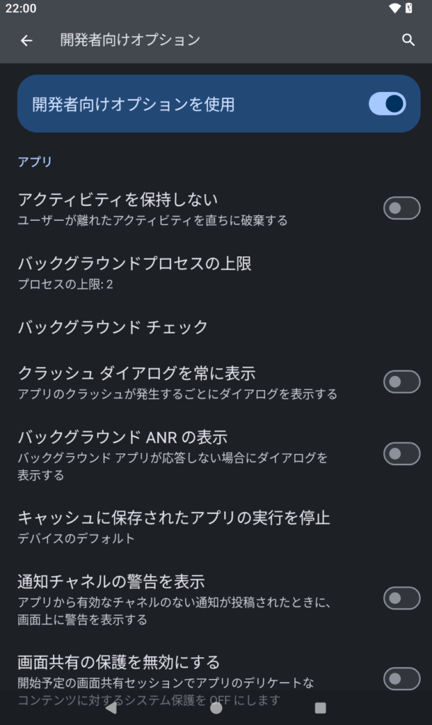 1. システム(または「その他設定」)→ 開発者向けオプション が出る